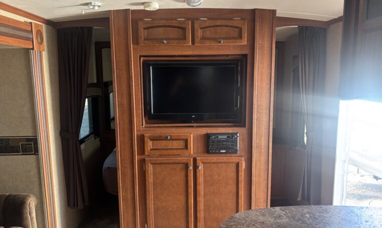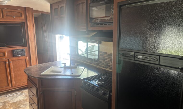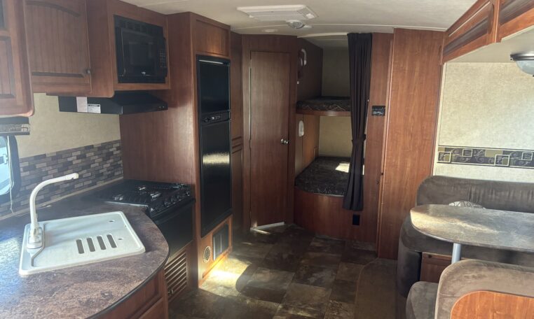 Rear double over double bunk beds, front queen bed, exterior refrigerator, fiberglass exterior, power hitch jack, second entry door, 5,460 lbs, 635 lbs hitch weight$13,500